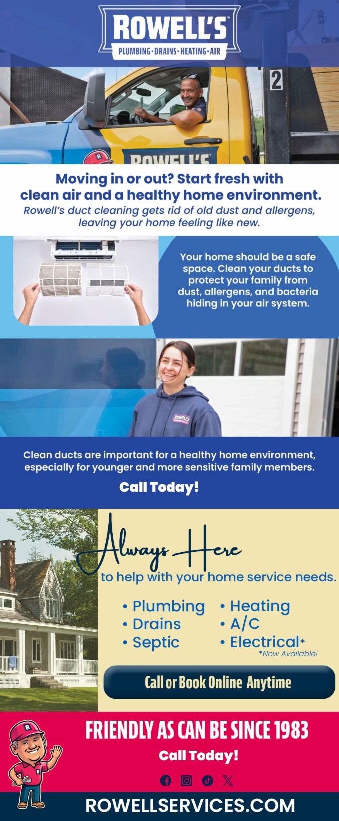 "Friendly As Can Be Since 1983!" When you need help with your plumbing, drains, heating, cooling or electrical in Danbury, you can always rely on Rowell's Services! Call us now or book online!